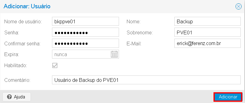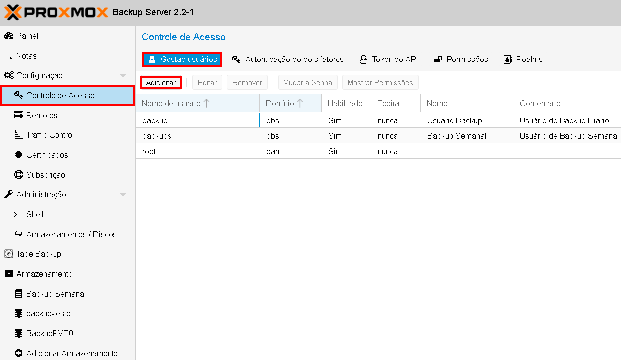 Depois de preencher todos os campos, clique em Criar. Então o processo de integração entre o Proxmox VE e Proxmox Backup Server estará finalizado.