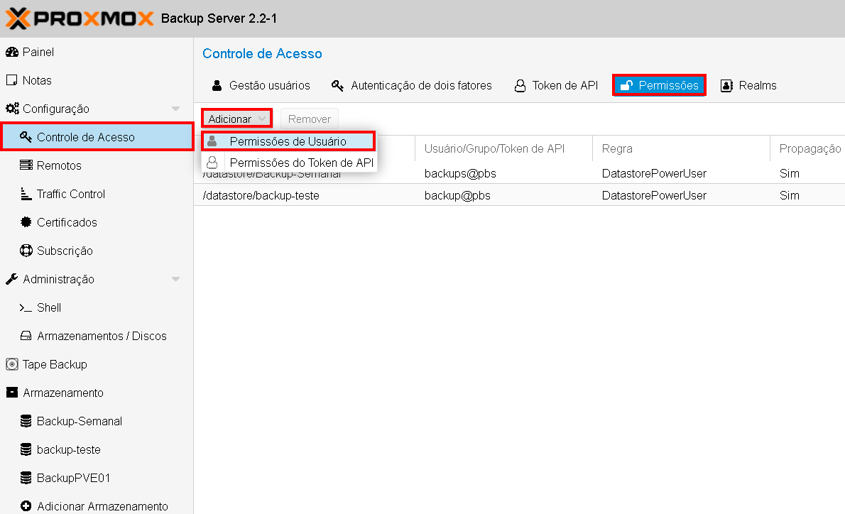 1 – Acesse seu PBS e vá em Armazenamento > Adicionar Armazenamento para criarmos a unidade onde os backups ficarão;